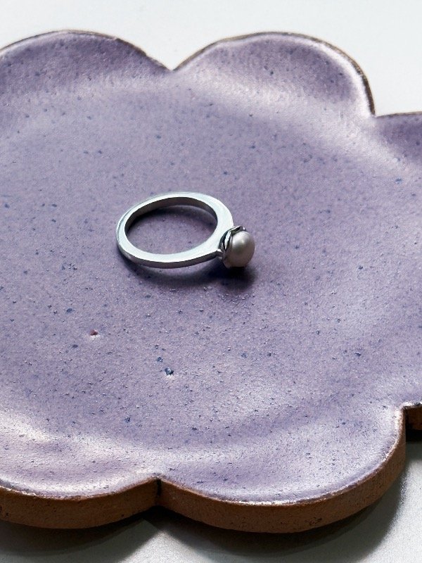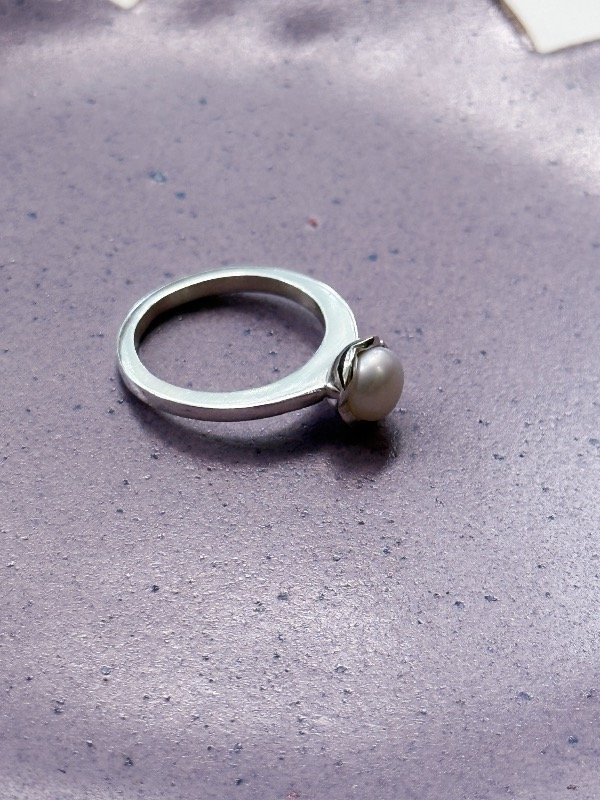 Con líneas clásicas, lo tallé en cera. El detalle de la perla de río en su centro lo hace un anillo perfecto para todos los días. Como anillo de compromiso lo encuentro perfecto.
