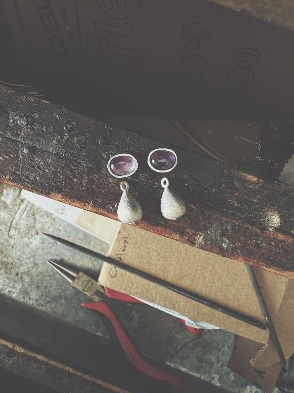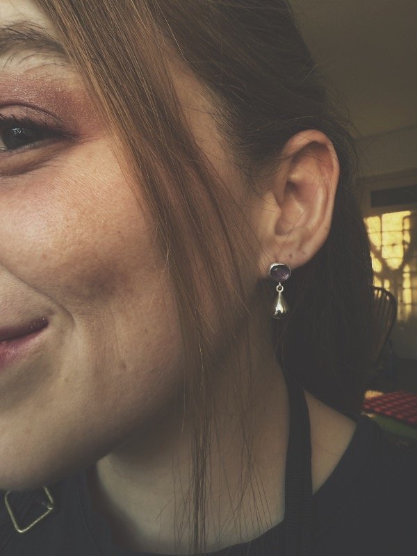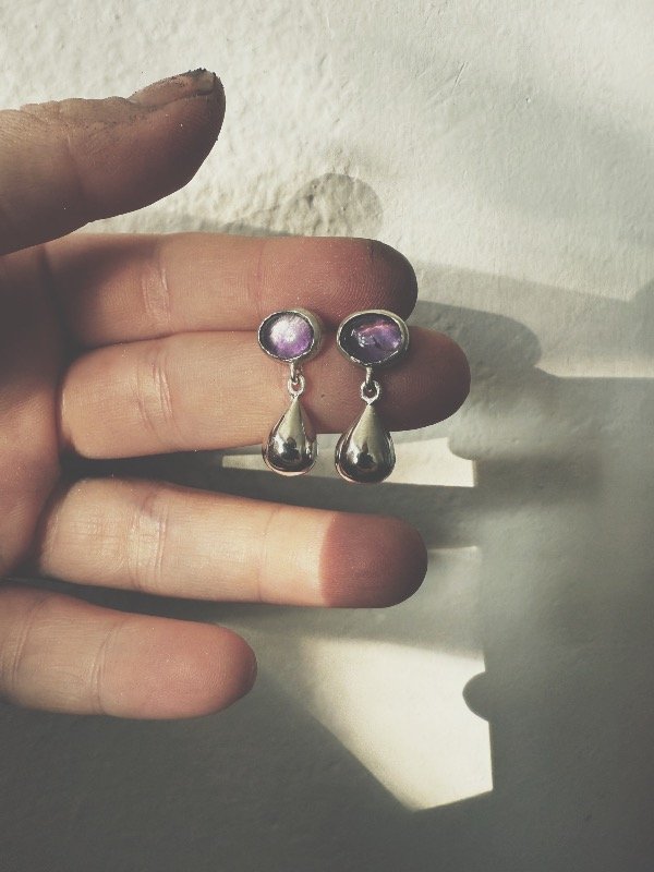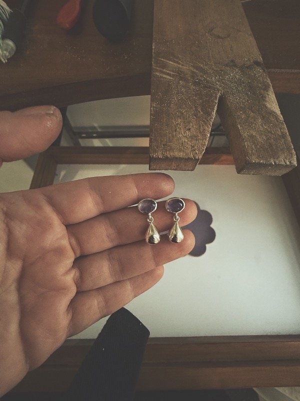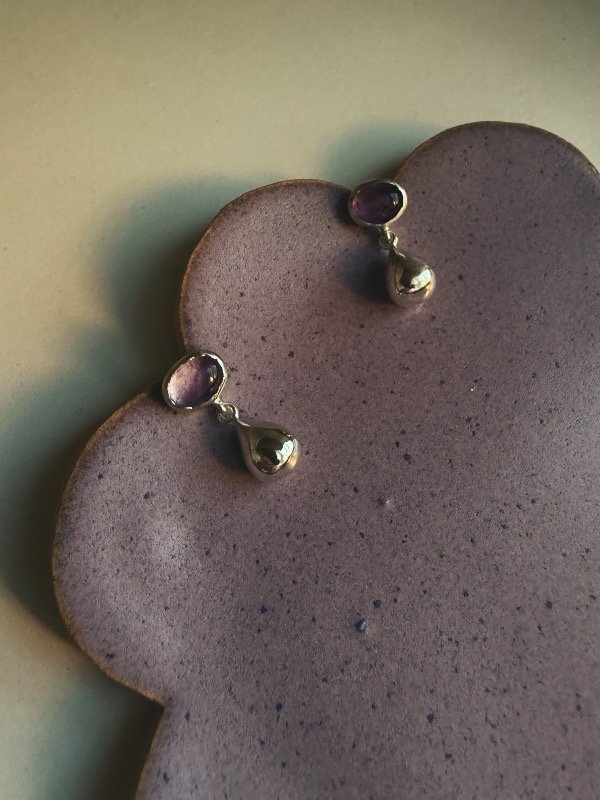 Dos amatistas ovaladas junto con el ya clásico droplet, en una serie de aros que combinan distintas piedras.