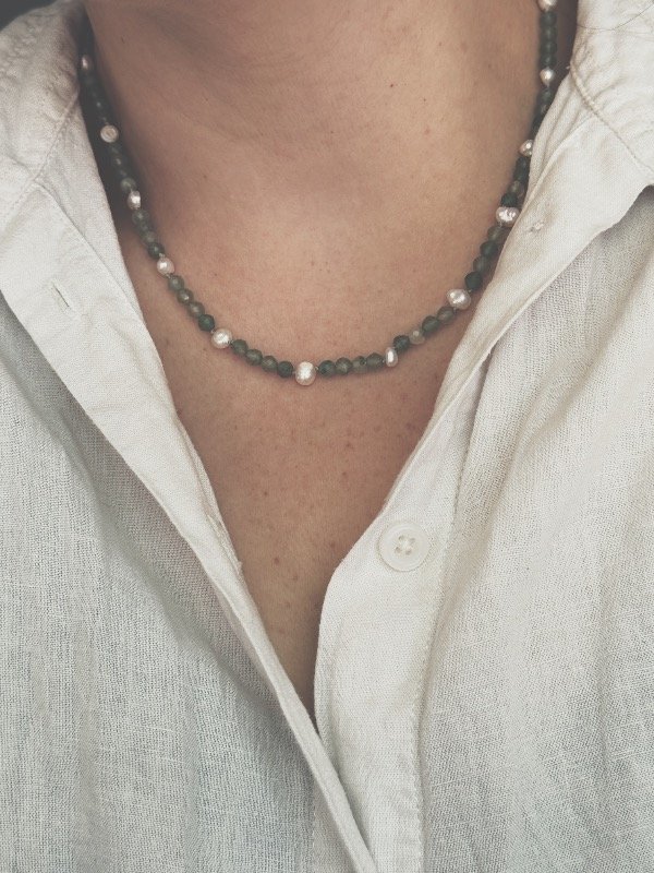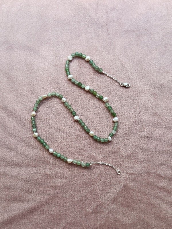 Collar enhebrado tradicional con nudo. Cuarzo verde y perlas naturales. Terminación de cadena con cierre en plata 925.